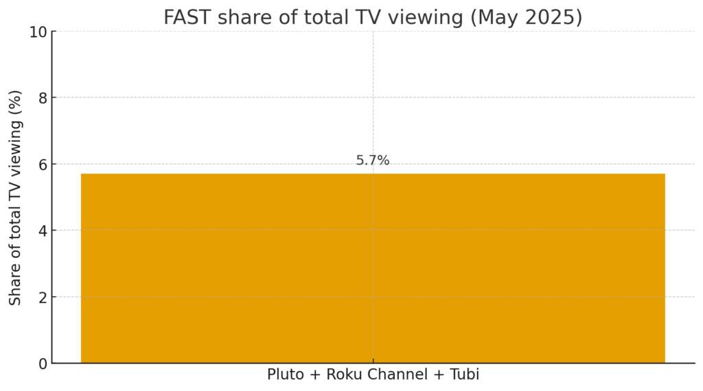 In May 2025, Nielsen highlighted that Pluto TV, The Roku Channel, and Tubi collectively accounted for 5.7% of total TV viewing, a significant milestone that demonstrates FAST is now an integral part of everyday TV habits. Nielsen